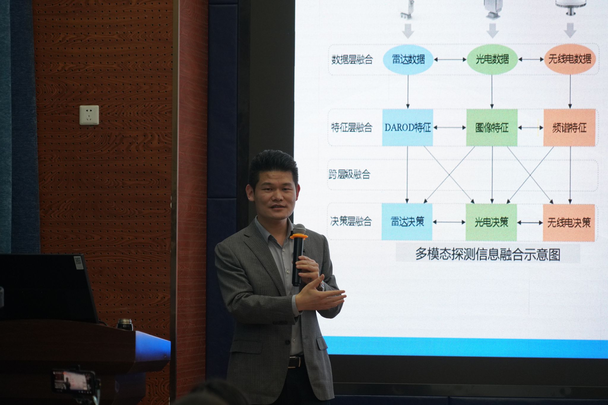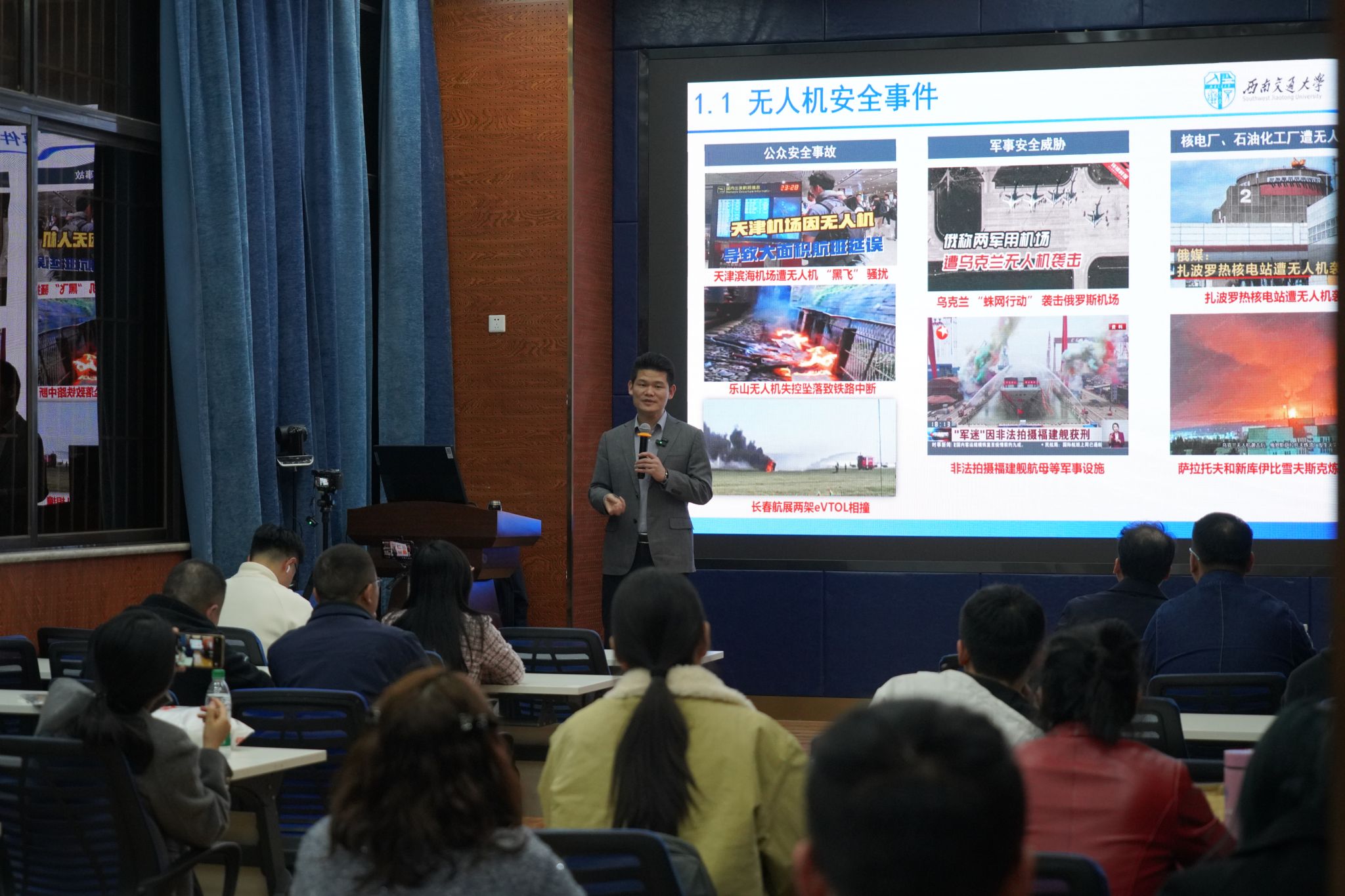 讲座中,吴浩博士深入探讨了无人机技术发展现状及其带来的安全挑战,重点分析了“低慢小”目标探测与防控的难点。其次,吴浩博士对军用、警用、民用等不同场景下的反无人机解决方案进行了系统介绍。在军用方面,他详细分析了无人机集群、光纤无人机、穿越机的反制策略;在警用方面,分析了重大保障案例并提出解决方案;在民用方面,他列举了机场、景区、工业园区、城市核心区等敏感区域出现的低空安全问题并提出解决措施。